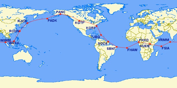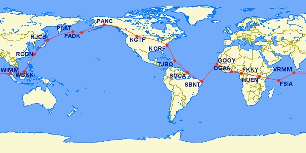 The National Aeronautical Association (NAA) allow only a primary route and a alternate route for calculating distance in a record attempt. You are allowed to make additional stops, but every listed stop must be made for the record to be valid.